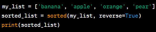 #내림차순 정렬 my_list = ['banana', 'apple', 'orange', 'pear'] sorted_list = sorted(my_list, reverse=True) print(sorted_list) #결과 #['pear', 'orange', 'banana', 'apple']